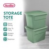With 18 gallons of interior space, the large-sized container perfectly holds bulky and large objects. Blankets, towels, seasonal decorations, clothing, games, and other items fit neatly inside, letting you store them away without hassle. Solid, in-molded handles allow you to easily transport the tote anywhere, perfect for moving apartments or hauling into the attic or basement. Entirely stackable, place one box on top of another to maximize your storage space.
