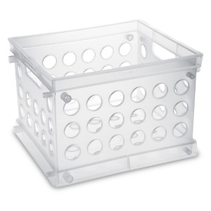 We have several of these very strong, Sterilite mini crates and use them in a variety of ways. These are perfect in our basement chest freezer where they hold our individual steaks, pork chops and other small meats that we have shrunk wrapped. The crates are freezer safe, stacking nicely on top of each other, and nothing falls to the bottom of the freezer. These crates are also perfect for the higher shelves in the kitchen cabinets where we store items like baking mixes, extra spices, and various food pouches and envelopes. The crates are easy to grab and pull down from the shelf, without needing a stool, by putting a finger in the circle hole and pulling forward. You can reach every item on the shelf because they are the perfect depth for our cabinets. We also have the mini crates storing our extra coffee pods that are not on the carousel by the coffee maker. The crates with the pods are double stacked on the top shelf of another cabinet. We own many Serilite products but the mini crates are among my favorite and we literally use them every day.