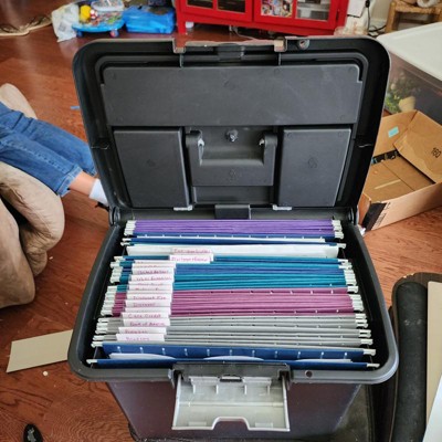 The portable file box is praised for its convenience and design, making it ideal for organizing and transporting important documents. Guests appreciate its ample storage capacity and the handy top compartment for office supplies. However, concerns about the durability of the latch and hinges have been noted, with many guests experiencing issues after limited use. Overall, it serves well for various organizational needs, especially for those on the go.