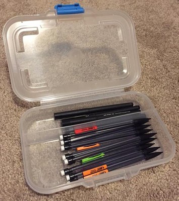 I am an Architect and use this type of box (I have a number of them) to store drafting equipment, mechanical pencils and other items I use on a daily basis. They help keep these small items organized and available to use in my desk drawers. Being clear, they are easy to locate the item I need and want. The closure clip is strong and prevents spills. I highly recommend this storage case for any type of office or desk supplies.