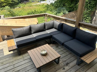 Prepare your summer with a sectional set that will bring a whole new look to your outdoor space. Featuring beautiful faux wood accents atop an aluminum frame, this set brings unparalleled style to your outdoor space as well as convenient space with its built-in side tables. Not only does this set offer a convenient space to set a refreshing drink or a bowl of snacks but it also offers plush water-resistant cushions that provide ultimate comfort for you and your guests, allowing you to enjoy summer to the fullest.