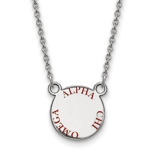 - Unique Features - Show your greek life spirit with this Alpha Chi Omega Sorority necklace. It is crafted with rhodium plated sterling silver and is 18 Inches in length. The pendant is 12mm in width and 12mm in height (0.47 in x 0.47 in) and dangles from a 1.25mm wide cable chain. We are a certified Collegiate jewelry retailer and this authentic item is licensed by the Alpha Chi Omega Sorority and Greek Life. This enameled pendant necklace is made the USA.