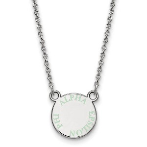 - Unique Features - Show your greek life spirit with this Alpha Epsilon Phi Sorority necklace. It is crafted with rhodium plated sterling silver and is 18 Inches in length. The pendant is 12mm in width and 12mm in height (0.47 in x 0.47 in) and dangles from a 1.25mm wide cable chain. We are a certified Collegiate jewelry retailer and this authentic item is licensed by the Alpha Epsilon Phi Sorority and Greek Life. This enameled pendant necklace is made the USA.