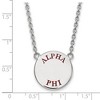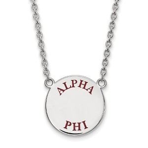 - Unique Features - Show your greek life spirit with this Alpha Phi Sorority necklace. It is crafted with rhodium plated sterling silver and is 18 Inches in length. The pendant is 19mm in width and 19mm in height (0.75 in x 0.75 in) and dangles from a 1.95mm wide cable chain. We are a certified Collegiate jewelry retailer and this authentic item is licensed by the Alpha Phi Sorority and Greek Life. This enameled pendant necklace is made the USA.