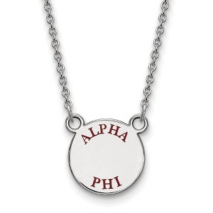 - Unique Features - Show your greek life spirit with this Alpha Phi Sorority necklace. It is crafted with rhodium plated sterling silver and is 18 Inches in length. The pendant is 12mm in width and 12mm in height (0.47 in x 0.47 in) and dangles from a 1.25mm wide cable chain. We are a certified Collegiate jewelry retailer and this authentic item is licensed by the Alpha Phi Sorority and Greek Life. This enameled pendant necklace is made the USA.