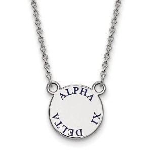 - Unique Features - Show your greek life spirit with this Alpha Xi Delta Sorority necklace. It is crafted with rhodium plated sterling silver and is 18 Inches in length. The pendant is 12mm in width and 12mm in height (0.47 in x 0.47 in) and dangles from a 1.25mm wide cable chain. We are a certified Collegiate jewelry retailer and this authentic item is licensed by the Alpha Xi Delta Sorority and Greek Life. This enameled pendant necklace is made the USA.