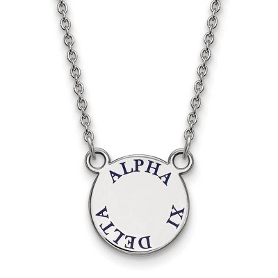 - Unique Features - Show your greek life spirit with this Alpha Xi Delta Sorority necklace. It is crafted with rhodium plated sterling silver and is 18 Inches in length. The pendant is 12mm in width and 12mm in height (0.47 in x 0.47 in) and dangles from a 1.25mm wide cable chain. We are a certified Collegiate jewelry retailer and this authentic item is licensed by the Alpha Xi Delta Sorority and Greek Life. This enameled pendant necklace is made the USA.