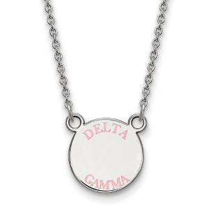- Unique Features - Show your greek life spirit with this Delta Gamma Sorority necklace. It is crafted with rhodium plated sterling silver and is 18 Inches in length. The pendant is 12mm in width and 12mm in height (0.47 in x 0.47 in) and dangles from a 1.25mm wide cable chain. We are a certified Collegiate jewelry retailer and this authentic item is licensed by the Delta Gamma Sorority and Greek Life. This enameled pendant necklace is made the USA.