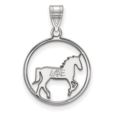 • Unique Features - Show your greek life spirit with this Delta Phi Epsilon Sorority pendant. It is crafted with rhodium plated sterling silver and without the bail is 15mm in height and 17mm in width (0.59 in x 0.67 in). With the bail, the measurements are 21mm in height and 17mm in width. We are a certified Collegiate jewelry retailer and this authentic item is licensed by the Delta Phi Epsilon Sorority and Greek Life. This pendant is made the USA. Chain not included.