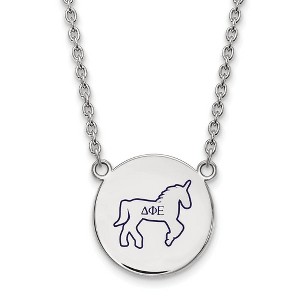 - Unique Features - Show your greek life spirit with this Delta Phi Epsilon Sorority necklace. It is crafted with rhodium plated sterling silver and is 18 Inches in length. The pendant is 19mm in width and 19mm in height (0.75 in x 0.75 in) and dangles from a 1.95mm wide cable chain. We are a certified Collegiate jewelry retailer and this authentic item is licensed by the Delta Phi Epsilon Sorority and Greek Life. This enameled pendant necklace is made the USA.