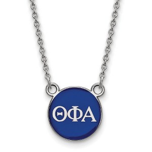 - Unique Features - Show your greek life spirit with this Theta Phi Alpha Sorority necklace. It is crafted with rhodium plated sterling silver and is 18 Inches in length. The pendant is 12mm in width and 12mm in height (0.47 in x 0.47 in) and dangles from a 1.25mm wide cable chain. We are a certified Collegiate jewelry retailer and this authentic item is licensed by the Theta Phi Alpha Sorority and Greek Life. This enameled pendant necklace is made the USA.