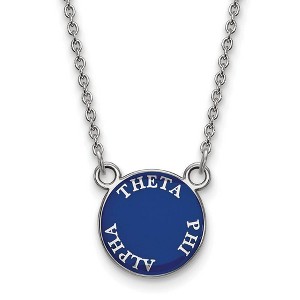 - Unique Features - Show your greek life spirit with this Theta Phi Alpha Sorority necklace. It is crafted with rhodium plated sterling silver and is 18 Inches in length. The pendant is 12mm in width and 12mm in height (0.47 in x 0.47 in) and dangles from a 1.25mm wide cable chain. We are a certified Collegiate jewelry retailer and this authentic item is licensed by the Theta Phi Alpha Sorority and Greek Life. This enameled pendant necklace is made the USA.