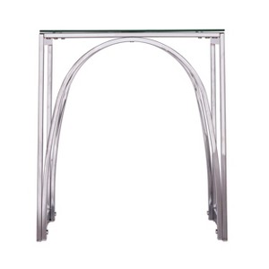 Modernize your living room look with this glass-top end table. An architectural frame forms elegant curves for a sleek, shiny look, while the square glass tabletop offers ample space for a reading lamp and your morning cup of coffee. Accent your space with sophisticated flair when you top this side table with a single vase for a simple, minimalist feel or with family photos and trinkets for a personalized look. Slide this metal and glass end table alongside your sofa or armchair and keep contemporary convenience by your side.