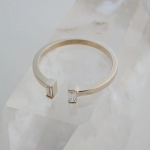 An open ring with two tiny crystal baguettes at either end. The adjustable band gives you the flexibility to switch the finger you wear it on. Wear it solo on your middle finger or wear it on your ring finger stacked alongside your favorite rings.