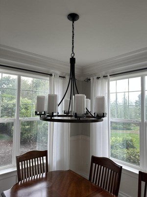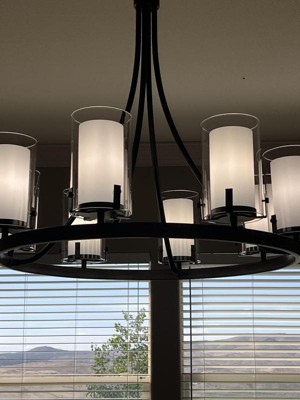 This chandelier is gorgeous and looks amazing in our entry way! It is very bright with 60W bulbs so you might consider installing a dimmer switch or using lower wattage bulbs. For reference, we have a 16' ceiling and antique bronze double entry doors with a window above. You could use it with rustic or transitional decor.