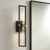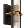 - Matte black finish frame and backplate. Warm antique brass finish accents. Clear ribbed glass.