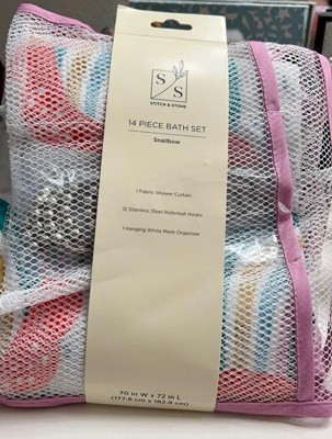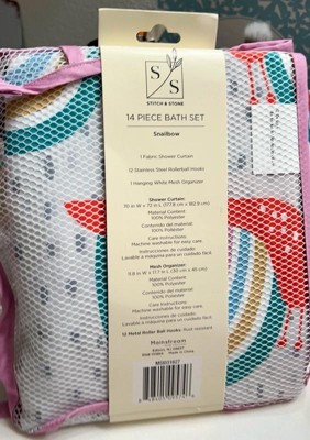 [This review was collected as part of a promotion.] I received the Stitch & Stone 14 Piece Bath Set from Influenster in exchange for my honest opinion. Included in the package is one fabric shower curtain, twelve stainless steel Rollerball hooks and one White Mesh Organizer. The Snailbow design is adorable. The snail shell is the rainbow, but not in typical rainbow colors. The colors go from a polka dot navy center to an arch of lavender, white, turquoise,white, gold, white,and teal. The snail is bright, dark orange. The Snailbow design repeats over a white background with blots of grey. The fabric is lightweight polyester, with a silky feel. The rollerball hooks are easy to apply and make for smooth open and close over any shower curtain bar. The mesh bag has a border of lavender to coordinate with the Snailbow shower curtain. There are two loops at the top to allow this bag to be hung.Unfortunately,there are no suction type hooks included to be able to hang this bag at a reasonable height to use. The bag could be hung from the hooks at the top of the shower curtain but for short people or children it would be not be usable. This is a cute set to brighten up the bathroom.