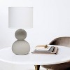 With two taupe ceramic stones vertically nested atop one another to form a strirdy base, this lamp stands at just under 16" in height. A beautiful white fabric drum shade completes this modern look! This is the perfect accent piece to illuminate your space of choice, as it's neutral design is made to compliment most spaces, in both residential and commercial environments.