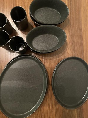 [This review was collected as part of a promotion.] I was so excited to own this charcoal dinnerware set! They are just like what I expected, from color to shape, to texture. The charcoal color is very close to black but much modern than a solid black color, and LOVE LOVE the shape being oval than round. The texture is a bit matt not glossy which is exactly what I LOVE also. Makes the dishes look so elevated! The only thing to call out is the bottom of the item is not glazed so be careful when place them on light color table cloth/placemat.