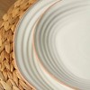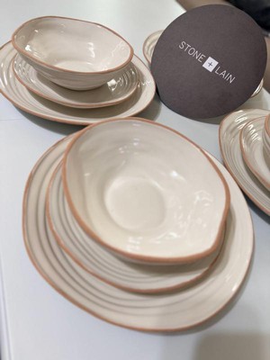 Casual and chic, the Stone Lain Nami Stoneware 12-Piece Dinnerware Set is a beach-inspired collection designed for your modern tablescape. Each piece mimics the raw movement and texture of oceanside sand, with one-of-a-kind shapes, free-form rims, and ripple detailing. Available in a glazed soft white, this set includes 4 10.9" dinner plates, 4 8.3" salad plates, and 4 7.5" cereal bowls.