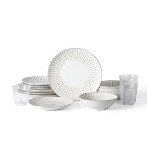 Find comfort in the simplicity of everyday meals with Stone Lain's Linea Stoneware 16-Piece Dinnerware Set. Made of durable stoneware, each dish is rimmed with textured linework, revealing a warm neutral base that accentuates this collection's artisanal look and feel. And with a set of ribbed glass cups, you can enjoy anything from a family breakfast to a three-course meal. This set comes with 4 large round 10.5” dinner plates, 4 round 8.2” salad plates, 4 deep round 7” bowls, and 4 12 oz glass cups.