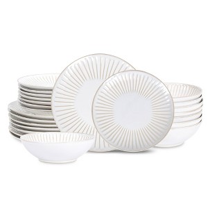 Elevate meals with Linea's unmatched Style. From trendy to classic, make a statement with this new dinnerware set. Stone Lain Linea 24-Piece Stoneware Dinnerware Set. Made of durable stoneware, with a unique but everyday style, to fill your home from day-to-day. It includes 8 large round 10.5” dinner plates and 8 round 8.2” salad plates, and 8 deep round 7” bowls.