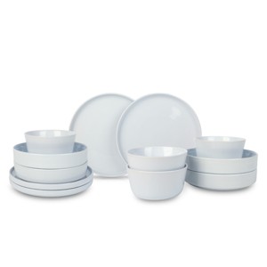 Stone Lain 12 pieces dinnerware set has an hip lip edge. Made of stoneware, this set includes 4 dinner plates, 4 bowls and 4 dinner bowls. The dishes are dishwasher and microwave safe. Excellent home or wedding registry gift.