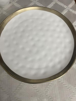 [This review was collected as part of a promotion.] This dinnerware set has a cool modern vibe with it's imperfect lines and hammered look, but the colors compliment any kitchen. My wife loves the gold trim that makes it look elegant enough for a nice dinner, but it's also simple enough to be used as an everyday set. The hammered spots all over the plates and mugs actually reminds me of golf balls and I love golf so I see no problem with this. When food is on the plate it is less noticeable, but I think that's kind of a cool feature. Great set.