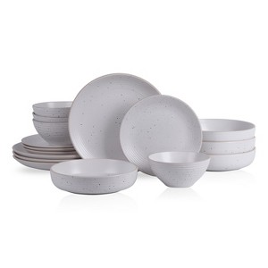 - Features a stunning speckled design with a neutral color stoneware backdrop. Ridged rims and bowls round out the beautiful craftsmanship of these dishes.