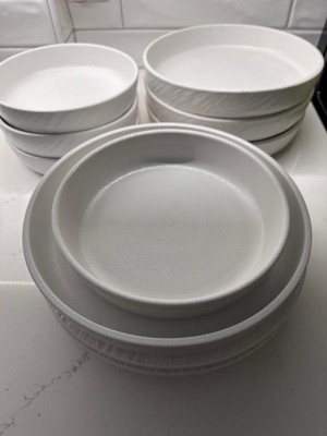[This review was collected as part of a promotion.] This is a beautiful dinnerware set. The crisp white look of this set contrasts with the diagonal texture along the edge of the plates and the same texture is repeated on the body of the bowls. The plates and bowls are heavy and cloudy; The textured finish shimmers in the light, especially candlelight. It is a good luxury material.