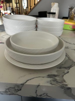 [This review was collected as part of a promotion.] This is a beautiful dinnerware set. The crisp white look of this set contrasts with the diagonal texture along the edge of the plates and the same texture is repeated on the body of the bowls. The plates and bowls are heavy and cloudy; The textured finish shimmers in the light, especially candlelight. It is a good luxury material.