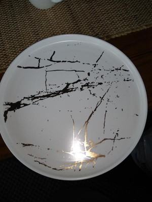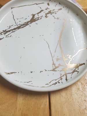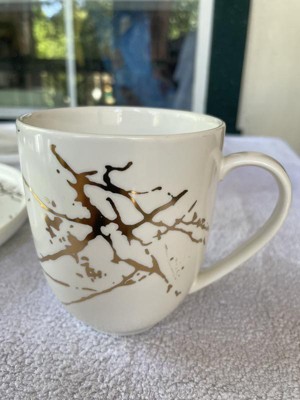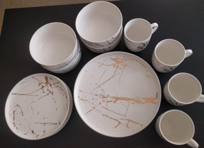 - Fun and trendy design, features gold splashes on each matte porcelain plate, bowl and mug.