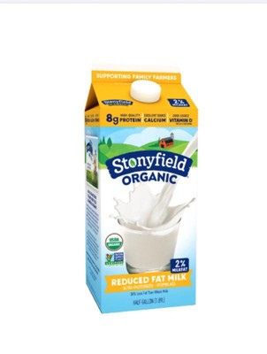 Stonyfield® Organic Reduced Fat Milk 0.5 gal. Carton. Tried some of Stonyfield’s tasty organic milk or cream yet? They’re further proof that dairy cows should always be free. Free of antibiotics, free of synthetic hormones, and free to graze outside. Stonyfield started nearly 4 decades ago to produce foods that are better for children, families, family farmers and their cows, and the planet. Today, as co-founder, I'm proud to say Stonyfield is more committed to that mission than ever. --Gary. You love that this milk is made without the use of toxic persistent pesticides and artificial hormones. From yogurts for babies, kids and adults to smoothies, frozen yogurt and dairy-free yogurt, all Stonyfield products are organic.