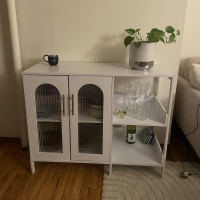 Update your living space with the elegant and functional Storage Accent Cabinet Sideboard Buffet. Featuring two curved tempered glass doors and a roomy interior, this cabinet is perfect for displaying and organizing your flatware, china, photo albums, or book collections. The white finish and light oak interior, complemented by brass handles, bring a minimalist and sophisticated touch to any room. With an adjustable shelf, you can easily accommodate items of various sizes. Designed to blend seamlessly with both contemporary and farmhouse-style interiors, this cabinet adds a classic and luxurious vibe to your home. Easy to assemble and constructed with care, this sideboard is the ideal storage solution for your living room, dining room, or entryway. Enjoy the perfect combination of style and functionality with this beautiful accent cabinet.