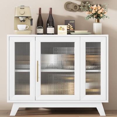 Feature:Introducing this modern sideboard buffet cabinet, designed to elevate your home decor with its stylish fluted glass doors and elegant metal gold handle. Perfect for both large and small spaces, this accent cabinet brings a luxurious touch to any room while providing ample storage. It features a spacious tabletop ideal for placing your coffee maker or showcasing your home decor.This functional storage cabinet is equipped with adjustable shelves at three heights, allowing you to adjust the interior to accommodate various items effortlessly. The cabinet is both waterproof and wear-resistant, ensuring easy maintan. The solid wood legs and tempered fluted glass door add to the overall sturdiness and stability of the piece.This cabinet can be utilized in kitchen, entrytway, living room, seamlessly blending with any home decor style. Transform your space with this chic and functional buffet cabinet, perfect for meeting all your storage and decorative needs.