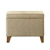 Our small storage ottoman is a smaller version of one of our best-selling storage benches. Made for style and convenience, this tan-colored ottoman is easily moved to accommodate guests, to hold a serving tray, or to quickly hide items out of sight beneath its hinged lid. With driftwood finished legs and a classic tan woven fabric, its casual look helps create a relaxed environment in your home. Easy to assemble and maintain. Please note that fabric and wood colors may appear slightly different due to variations in lighting or screen settings.