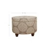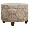 This classic round ottoman offered in fun designs creates a striking impact. The modern patterns in a textured flax blend is complemented by wood legs. This storage ottoman will add functional style to any space. Use it to store extra pillows or blankets in a bedroom, hide toys or controllers in the family room, or conceal accessories in the entryway. Pair two ottomans together and double the impact. The lift-off lid enables easy access to storage within. No assembly required; spot clean as needed. Please note that fabric and wood colors may appear slightly different due to variations in lighting or screen settings.