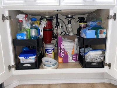 This StorageBud Two-Tier Sliding Under-sink organizer is the perfect solution for keeping your bathroom or kitchen tidy and organized. With its sturdy frame and shelves, it can hold all of your cleaning supplies, toiletries, and more. The sliding mechanism makes accessing the bottom shelf effortlessly. The sleek design fits perfectly in any cabinet, maximizing storage space while minimizing clutter. Say goodbye to messy cabinets and hello to a clean and organized home with this under-sink organizer!