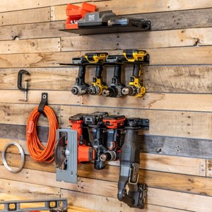 The Power Tool Organizer neatly holds drills, saws, multi tools, task lights, and more. Includes storage shelf for battery chargers, drill bits, hardware, and extra batteries. Made from solid alloy steel, the tool rack supports up to 35 lbs per level, up to 70 lbs total. Clear up space in your garage and have your tools ready for your next project!