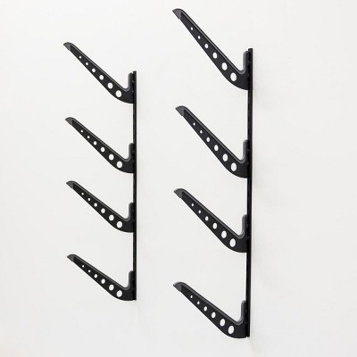 Made by StoreYourBoard, the leaders in outdoor sports storage, this Wakeboard Wall Storage Rack is an adjustable solution for all your wakeboards. Solid steel supports up to 100 lbs total. Adjustable levels fit 4 wakeboards, including bindings. Protective rubber lining gently holds boards without scratching. 60 degree angle shows off your board artwork for a stylish display. Quality hardware is included for easy install. Clear up space in your home, garage, or boathouse with this space-efficient wall rack!