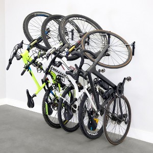 Optimize your bike storage system with the WheelRest 4-Pack, a set of four heavy-duty bike hooks designed for efficient, vertical wall mounting. Perfect for families, shared garages, or avid cyclists with multiple bikes, this system keeps your space organized while making bike access easy. Loading your bike is simple—just roll it onto its back wheel and hook the front tire into place. Unlike traditional hanging racks, the WheelRest keeps the rear wheel on the ground, minimizing stress on the rims and ensuring stability. The PVC-coated storage hooks protect your bike rims, preventing scratches and wear over time and ensuring that they never come into contact with the metal rack. Each bike hook features an adjustable design, allowing you to modify the height for different bike sizes without reinstallation. The quick-pull locking pin makes repositioning effortless—no tools required. Mounted to a single wall stud, these compact bike hooks position handlebars at an angle so you can store multiple bikes closer together without wasted space. Designed for home, apartment, and garage organization, this bike hanger provides space-saving bike storage that takes up minimal space. The WheelRest accommodates road bikes, mountain bikes, e-bikes, and kids’ bikes. The bike hooks hold tires up to 3" wide and support up to 75 lbs per hook. Made from industrial-grade steel, these durable bike hangers offer a strong, long-term solution for keeping bikes secure and accessible. Whether you're organizing a growing collection or setting up a shared bike storage system, the WheelRest 4-Pack delivers convenience, protection, and space efficiency.