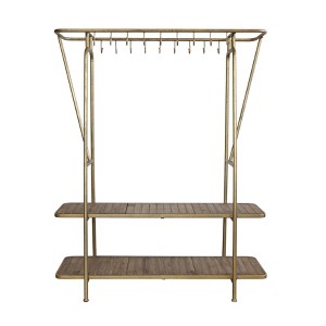 - This rack has two shelves for storage and display, 18 hooks for hanging items, and a gold finish for a luxurious touch