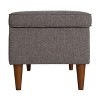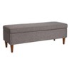 - Plywood and solid wood frame upholstered in soft grey polyester blend fabric with lined storage compartment and solid wood legs