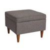 - Plywood and solid wood frame upholstered in soft grey polyester blend fabric with lined storage compartment and solid wood legs