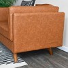 - Plywood and solid wood frame, pocket spring seat cushions for long lasting comfort, resilient foam core side cushions, tapered solid wood legs and cognac color vegan leather upholstery