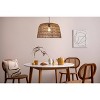 - This modern boho ceiling light showcases a woven paper rope shade hung from a black metal canopy