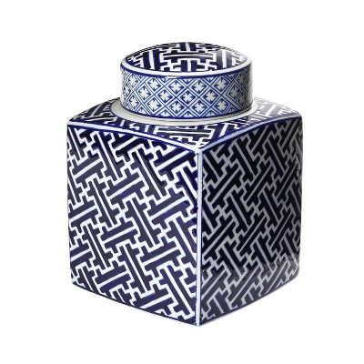 Storied Home Decorative Square Ceramic Ginger Jar with Lid, Blue and White