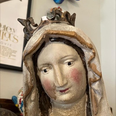 This vintage statue is perfect for any religious homes, or for holiday decoration. This statue features the Virgin Mary with a child, and is 50” high. It is a magnesia vintage reproduction, and is beautifully made. Whether it be for every day decoration, or simply for holiday décor, this beautiful statue is one-of-a-kind.