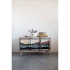- Add a touch of warmth and beauty to the space with this mango wood console that features two shelves and three-panel sunset scene woven rope doors with tassels