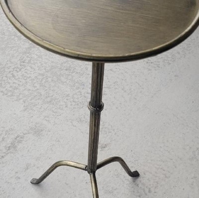 This glamorous accent table is a true ode to art deco style, featuring a timeless footed base and a raised edge tabletop that exudes both grace and functionality. Perfect for pairing with an accent chair in a living room or bedroom, or anywhere you need to rest a cocktail, this table is ideal for entertaining guests or enjoying a quiet evening at home. Assembling this piece is as effortless as it gets, as no tools are required. Made entirely of metal, this table radiates durability and longevity, while the compact size makes it easy to move from room to room. At 12.5 inches in diameter and 27.5 inches in height, this table is the epitome of versatility, allowing you to savor your favorite cocktail and relish delectable treats without sacrificing valuable space. Table measures 12.5 inches in diameter x 27.5 inches H; Maximum weight capacity of 11 pounds.